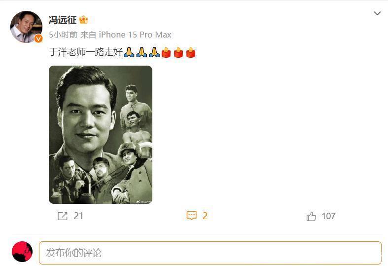 冯远征在社交账号发文“于洋老师一路走好”,并搭配上了于洋的剧照。