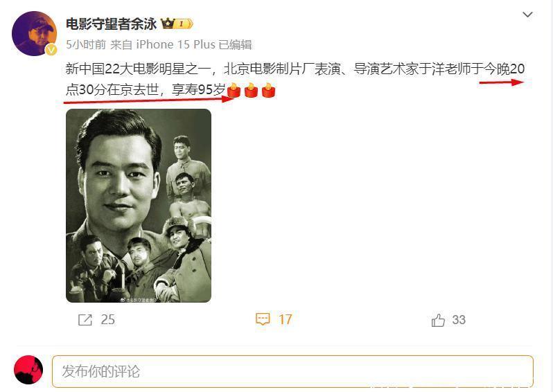 随后电影工作者余泳发文透露,于洋是在3月1日晚8点30分在北京去世。